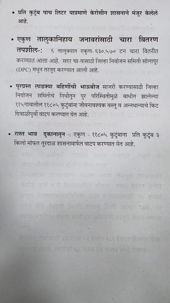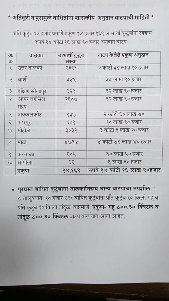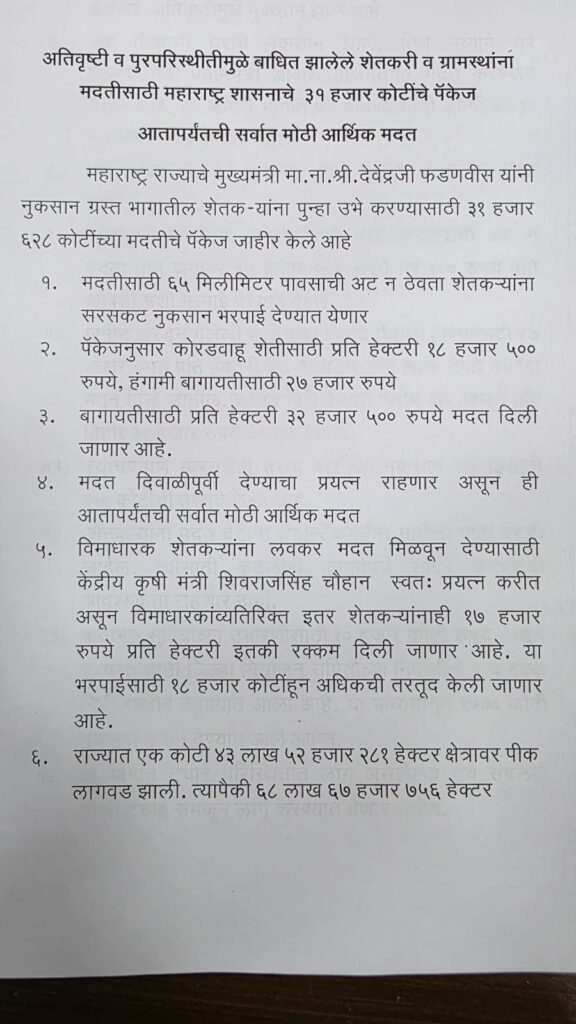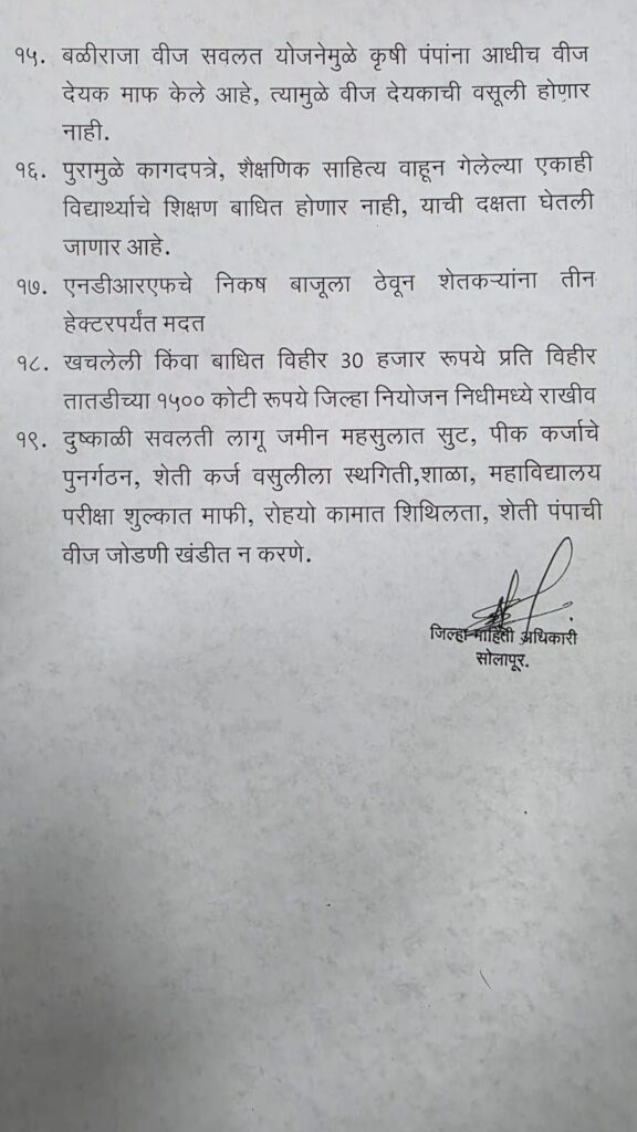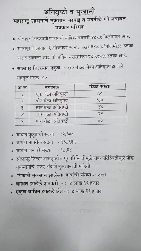 सोलापूर : अतिवृष्टी आणि पूरग्रस्तांना महाराष्ट्र शासनातर्फे देण्यात येणारी नुकसान भरपाई आणि मदत पॅकेज खालीलप्रमाणे आहे.