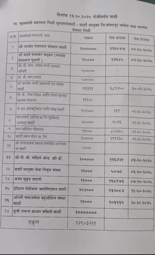 बार्शीकर एवढ्यावरच न थांबता बार्शीतील अनेक समाजसेवी संस्था, डॉक्टर, उद्योजक, व्यापारी, विविध संघटना यांनी देखील 29 लाख रुपये मुख्यमंत्री सहाय्यता निधीसाठी दिले आहेत.