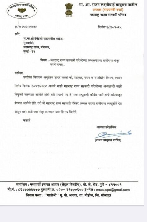 “मला हे सहकार परिषदेचे अध्यक्षपद राष्ट्रवादी काँग्रेस (अजित पवार गट) कडून मिळाले होते. मी आता पक्ष बदलल्यामुळे नैतिकतेच्या दृष्टीने या पदावर राहणे योग्य नाही. त्यामुळे मी माझा राजीनामा देत असून, तो स्वीकृत करण्यात यावा अशी मुख्यमंत्री फडणवीसांकडे विनंती करतो.”