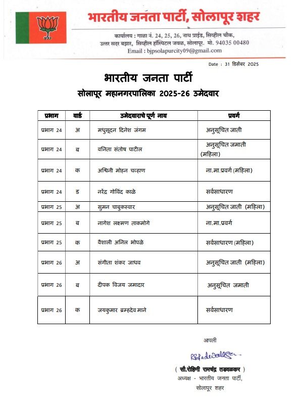 Tags: Breaking newsRohini TadwalkarsolapurSolapur bjpSolapur Mahapalika Election 2026solapur news