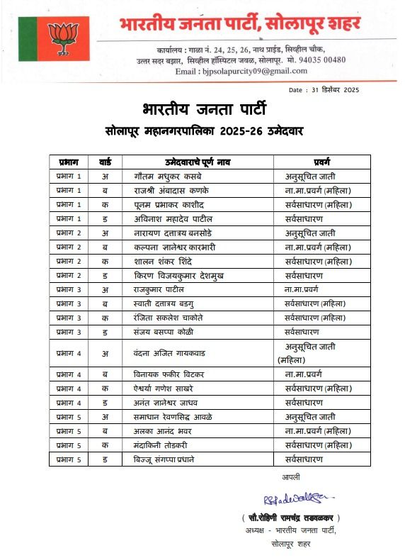 HELLO SOLAPUR | सोलापूर महापालिका निवडणुकीसाठी भारतीय जनता पक्षाकडून अंतिम यादी जाहीर करण्यात आली आहे. जाहीर केलेल्या यादीमध्ये अनेक दिग्गजांना धक्का बसला असून नव्या आणि युवा उमेदवारांना संधी देण्यात आली आहे.